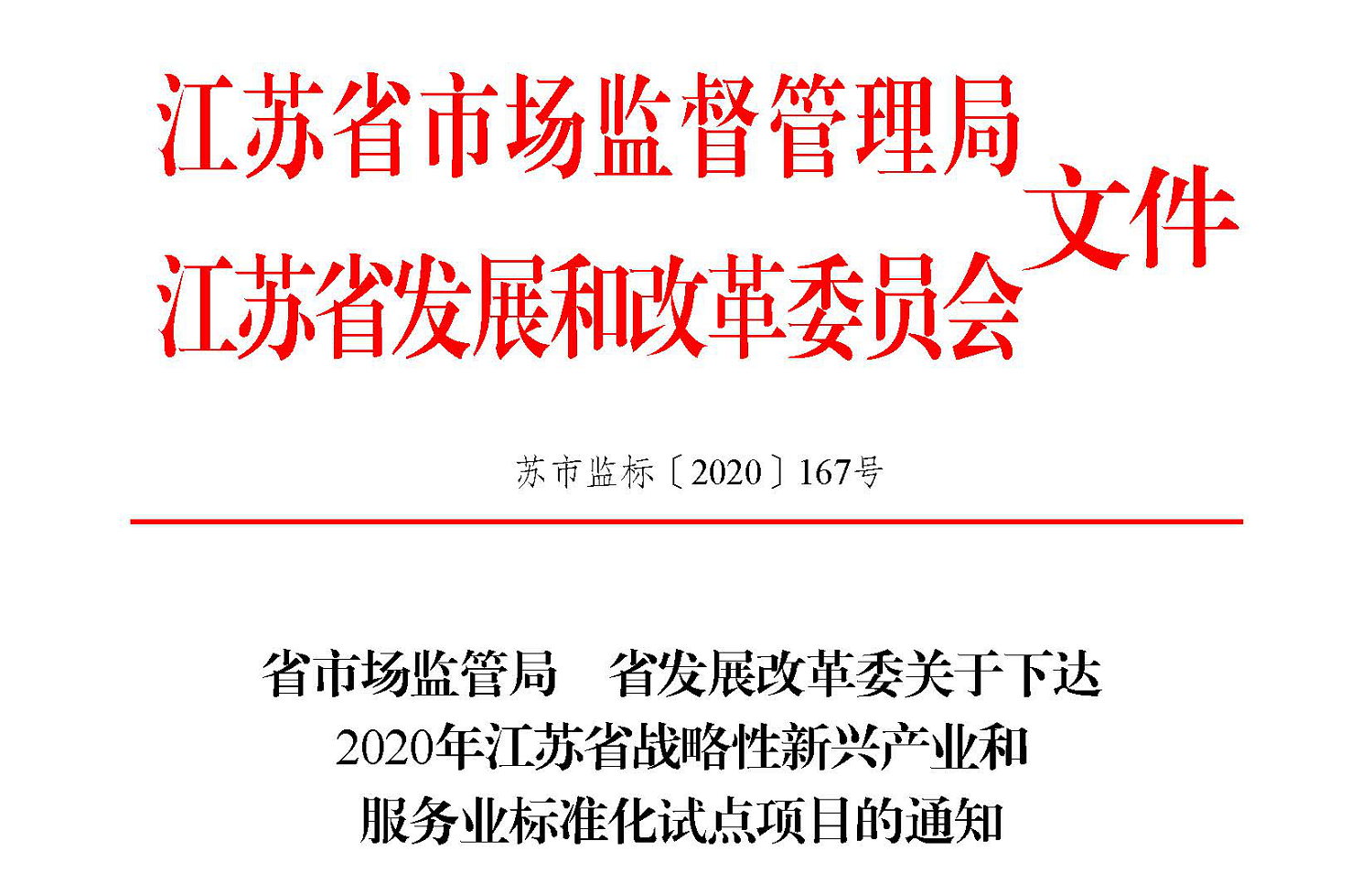 近日,江苏省市场监督管理局、江苏省发展和改革委员会下达“2020年江苏省战略性新兴产业和服务业标准化试点项目的通知”,