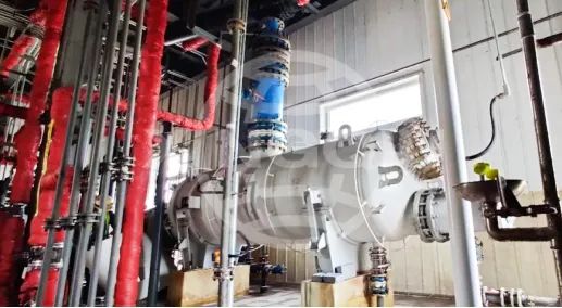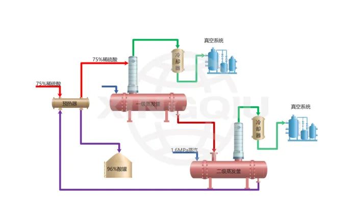 利用氯气干燥和氯化氢干燥系统副产的稀硫酸为原料,输入至我司自主研发、设计、供货的硫酸提浓系统,经蒸发浓缩生产≥96%H₂SO₄,生产的浓硫酸再回流至氯气干燥系统,从而使整个装置的硫酸得到了循环利用。