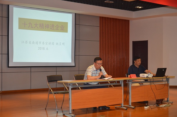为学习贯彻习近平新时代中国特色社会主义思想,深入推进“十九大精神进企业”, 6月22日下午,如皋市总工会邀请了市委宣讲团姚呈明老师及九华镇安监所陈所长,为公司全体党员干部及管理人员进行了精彩的“十九大精神进企业”主题宣讲及安全培训课程。