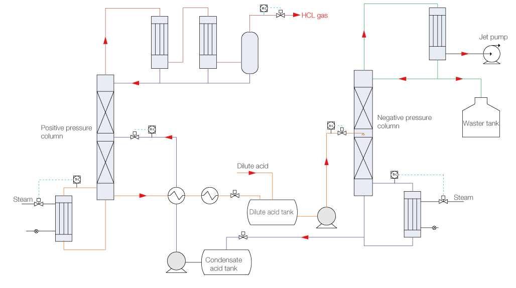 此工艺利用盐酸共沸浓度随压力的变化而变化生产出HCL气体。