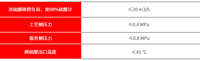 硫酸稀释冷却系统由石墨喷射混合器、石墨冷却器、连接管路及控制仪表、控制柜等构成,可将98%的浓硫酸稀释到任意所需的浓度,稀硫酸出口温度可控制在45℃以下。单套系统能够应对高达20 m